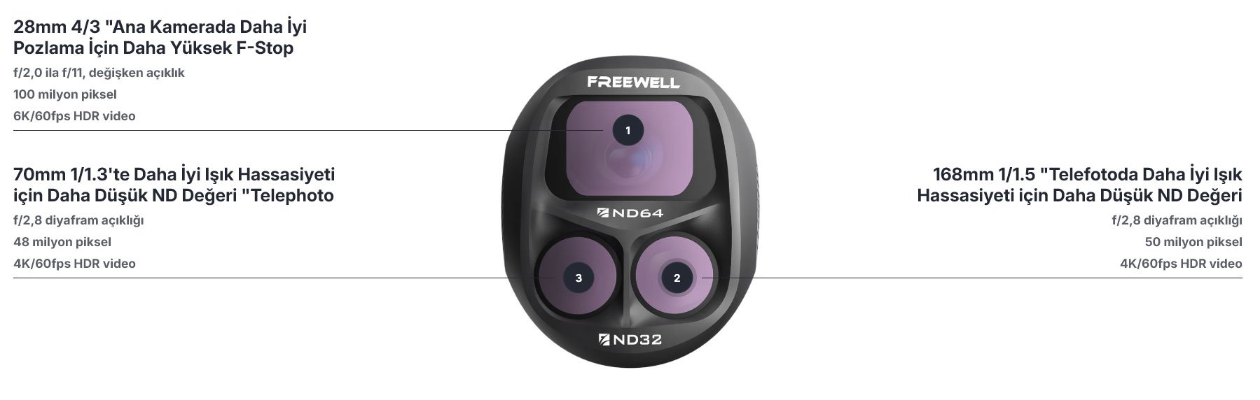 DJI Mavic 4 Pro Freewell Çift Odak Uzunluğu Bölünmüş ND Filtresi – Her çekim için hassas pozlama kontrolü sağlayan, değişen odak uzunlukları ve açıklıkların zorluklarını ele almak üzere tasarlanmıştır.