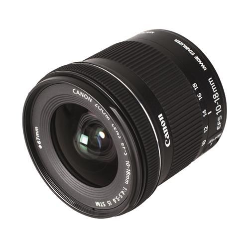 Kompakt bir hale de esnek bir geniş açı zum, EF-S 10-18mm f / 4.5-5.6 STM IS gelen CanonEF-S montajlı DSLR'ler için tasarlanmış 16-28,8 mm'ye eşdeğer bir lenstir. Yüksek optik kaliteyi korurken genel boyutu küçültmeye yardımcı olan dört gruplu bir yakınlaştırma tasarımı, bir ultra düşük dağılım elemanı, bir küresel olmayan eleman ve bir büyük çaplı eleman ile birlikte kromatik ve küresel boşluklardan keskin, net görüntü boşluğu üretmek için kullanılır. sapmalar. Arttırılmış kontrast ve renk nötrlüğü için parlamayı ve gölgelenmeyi bastırmak için bir Super Spectra kaplama da uygulanmıştır. Hem fotoğraf hem de video uygulamalarından faydalanan bir STM kademeli AF motoru, tam zamanlı manuel odak geçersiz kılma ile birlikte hızlı ve neredeyse sessiz otomatik odaklama performansını gerçekleştirmek için kullanılır. Ek olarak, dört kademeli etkili Görüntü Sabitleyici sistemi de bulunur ve daha keskin elde çekim için kamera sarsıntısının görünümünü en aza indirir.